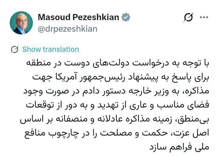 ▫️با توجه به درخواست دولت‌های دوست در منطقه برای پاسخ به پیشنهاد رئیس‌جمهور آمریکا جهت مذاکره، به وزیر خارجه دستور دادم در صورت وجود فضای مناسب و عاری از تهدید و به دور از توقعات بی‌منطق، زمینه مذاکره عادلانه و منصفانه بر اساس اصل عزت، حکمت و مصلحت را در چارچوب منافع ملی فراهم سازد.