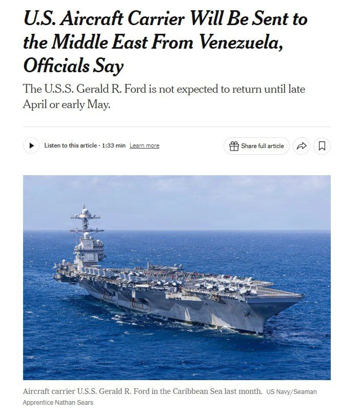 نیویورکتایمز: مقامهای آمریکایی اعلام کردند ناو هواپیمابر «یواساس جرالد فورد» به همراه ناوهای رزمی همراه به خاورمیانه اعزام خواهد شد